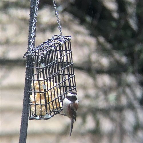 We get two chickadee species at our feeder. The Chestnut-backed is a conifer forest specialist.