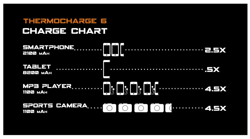 | Auto Charge Feature: | Plug into the standard USB Port and the ThermoCharge 6 will automatically start to charge your device |