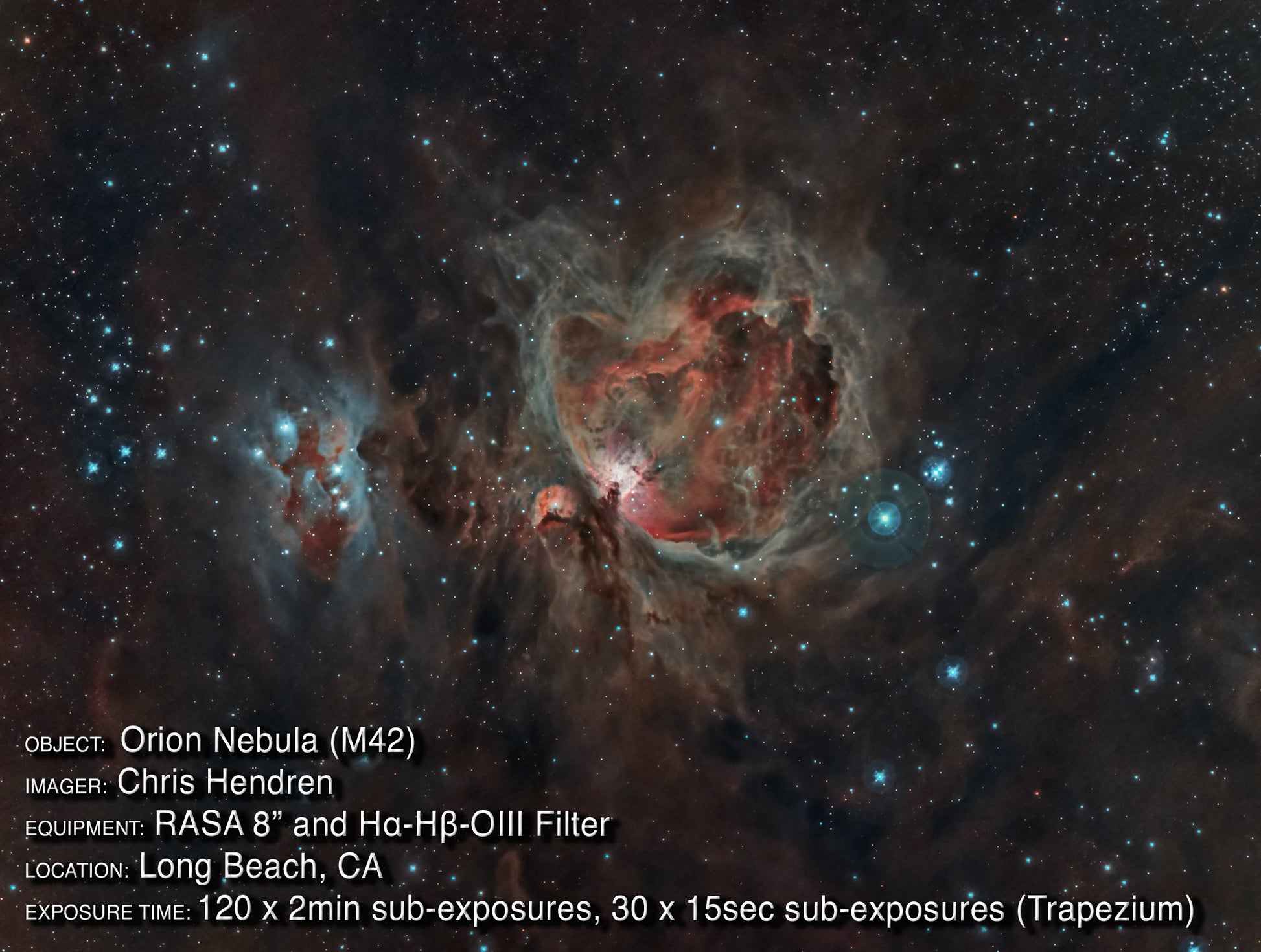 Bring out the best in your nebulae astroimages with the H-alpha H-beta OIII (Hα-Hβ-OIII) Imaging Filter for the 8” RASA. This specialized filter allows high transmission of light from emission nebulae while blocking light pollution, helping to make your images pop with detail off the black sky background with superior contrast.