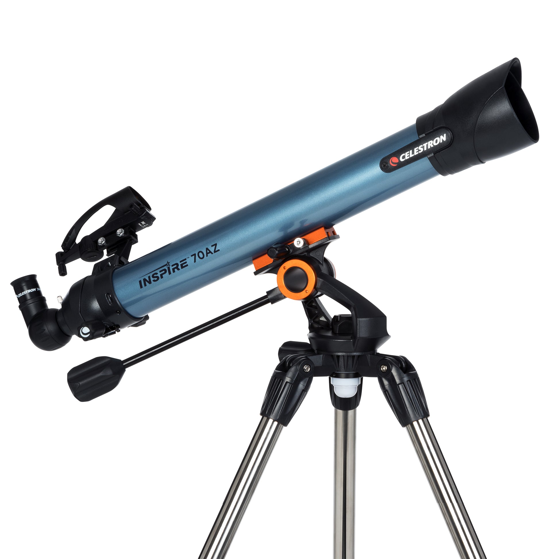 The Inspire 70 comes with two Kellner eyepieces (20mm and 10mm), a 90° erect image diagonal, an integrated smartphone adapter, a StarPointer® Pro finderscope, and a an integrated red LED flashlight/mount light. The two Kellner eyepieces offer different magnifications to view your intended object. The erect image diagonal allows for right-side-up viewing ideal for terrestrial subjects but can also be used for celestial objects. The StarPointer® Pro red dot finderscope will help you quickly center an object in your eyepiece for easier observing. The integrated flashlight/mount light can be used in to illuminate the built-in accessory tray and can be removed from the mount to use as a flashlight where you need it most.