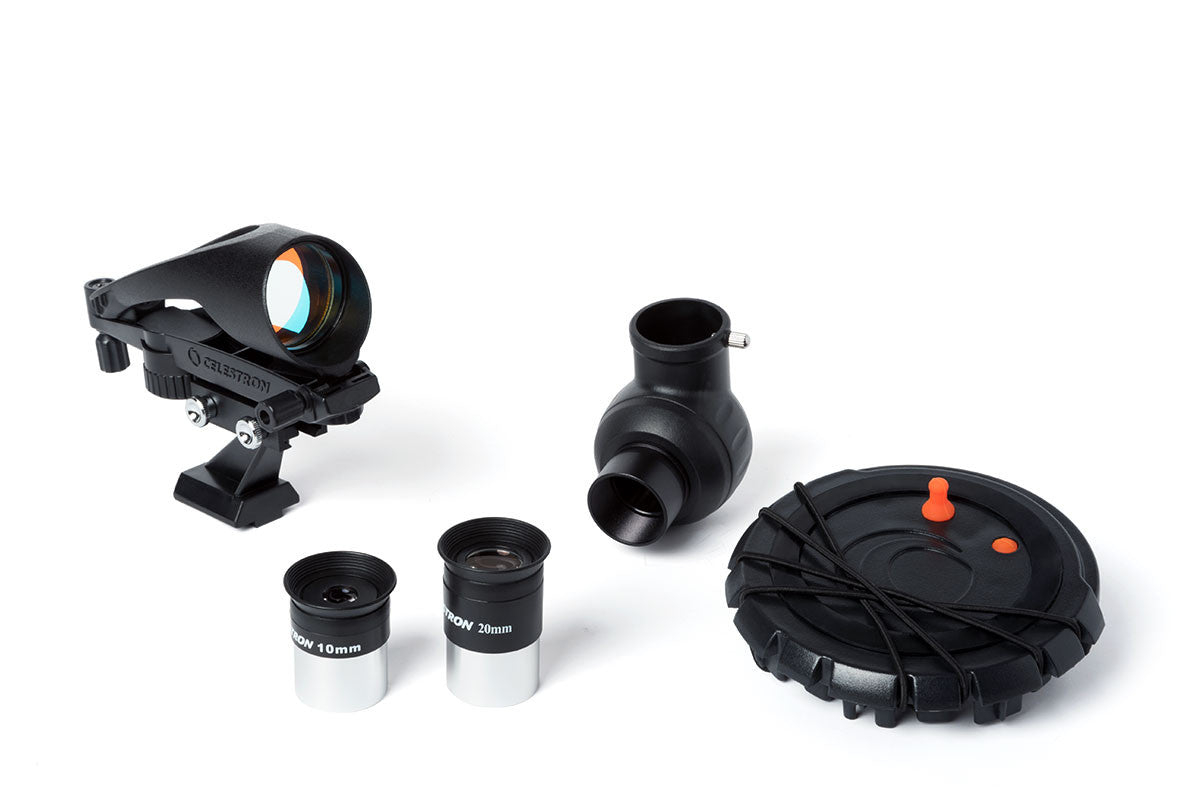 - Accessories include: two eyepieces (20mm and 10mm), erect image star diagonal, a red LED flashlight, StarPointer™ Pro red dot finderscope, and an integrated smartphone adapter.