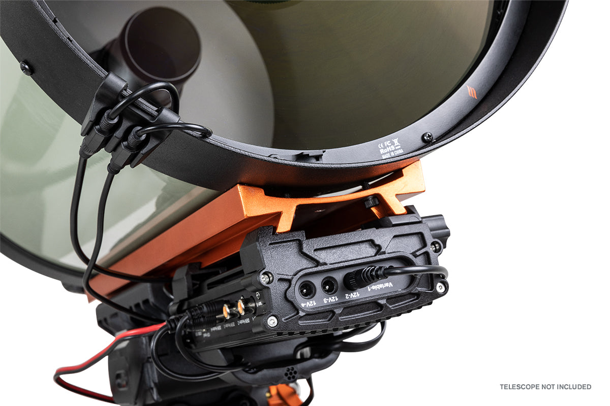 The integrated USB 3.2 hub connects three USB devices to your computer with only one cable, greatly simplifying cable management. There are three USB Type A ports, and each port is powered. Just like the 12V DC ports, you can power each USB port on or off using CPWI or a Celestron hand control.